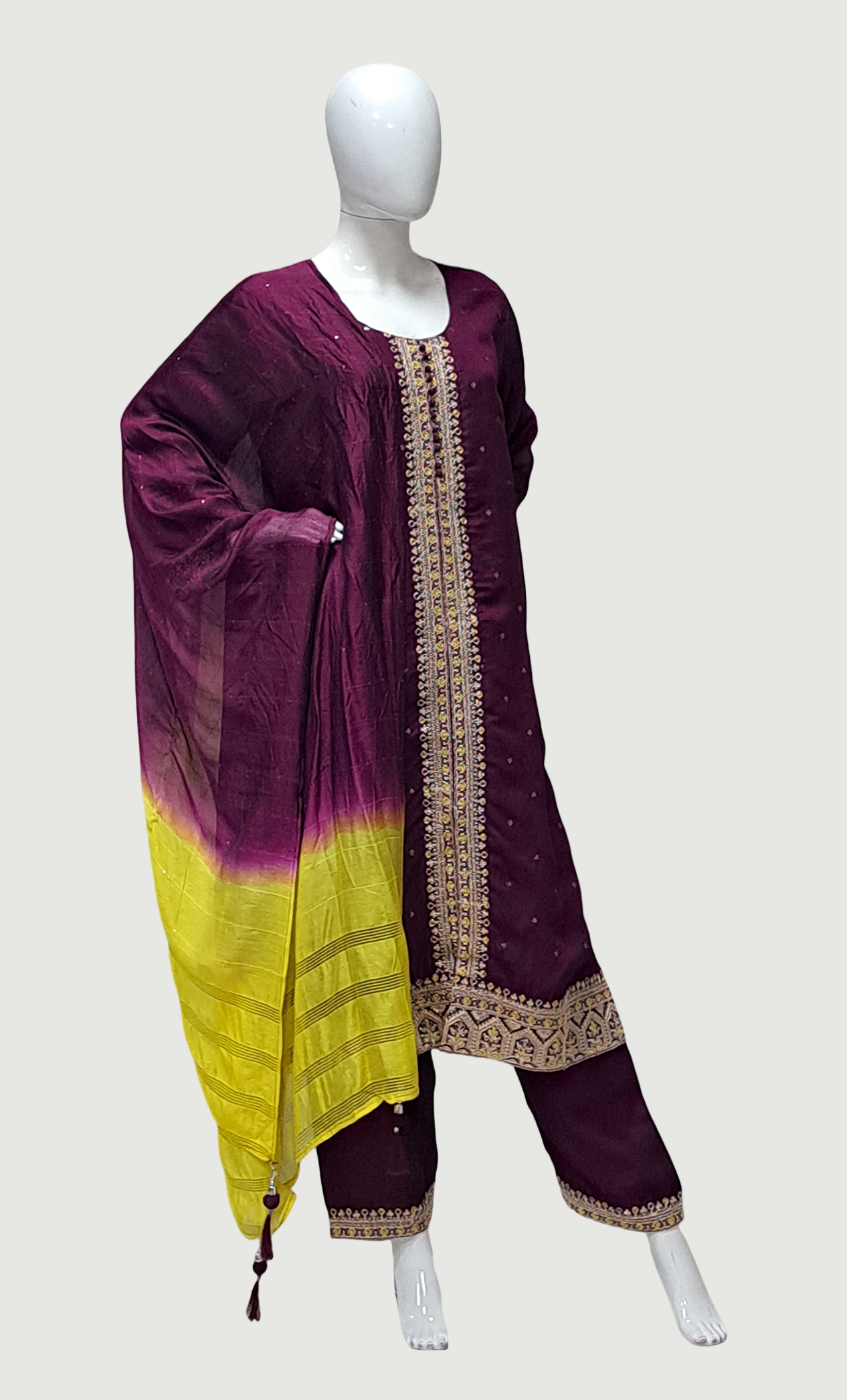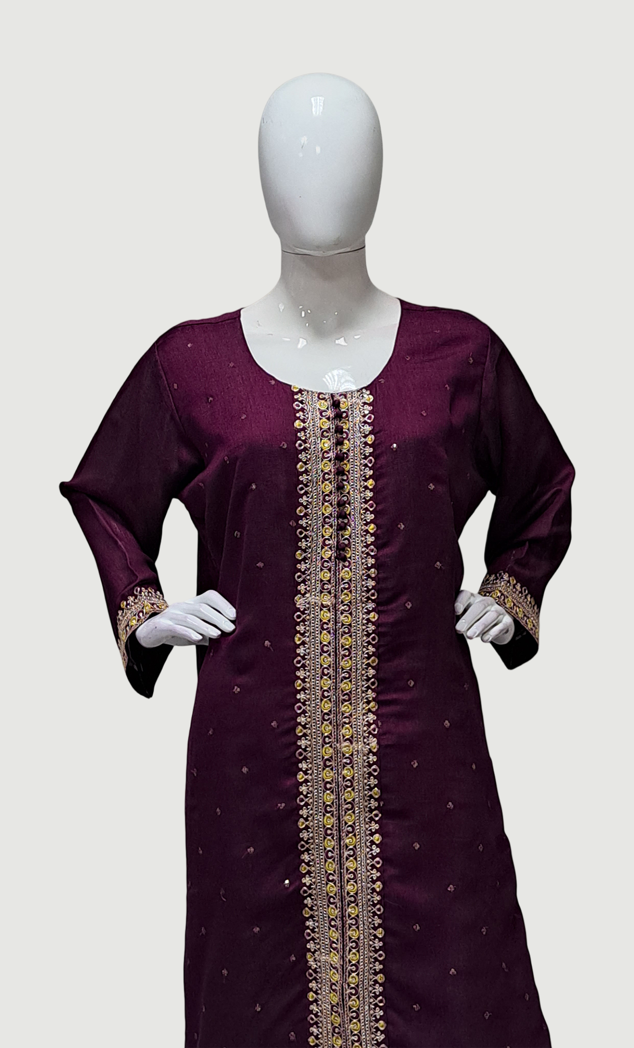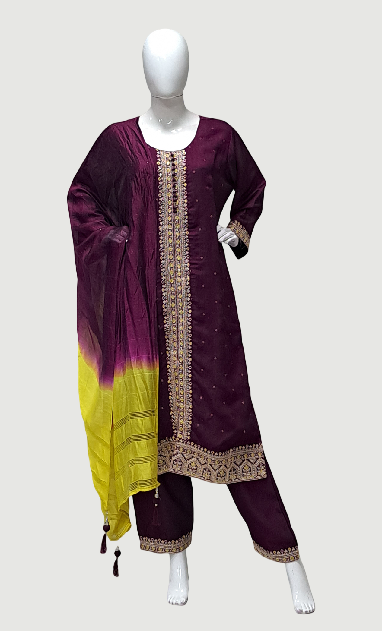 • Deep olive & grape cotton embroidered designs with gold woven finish