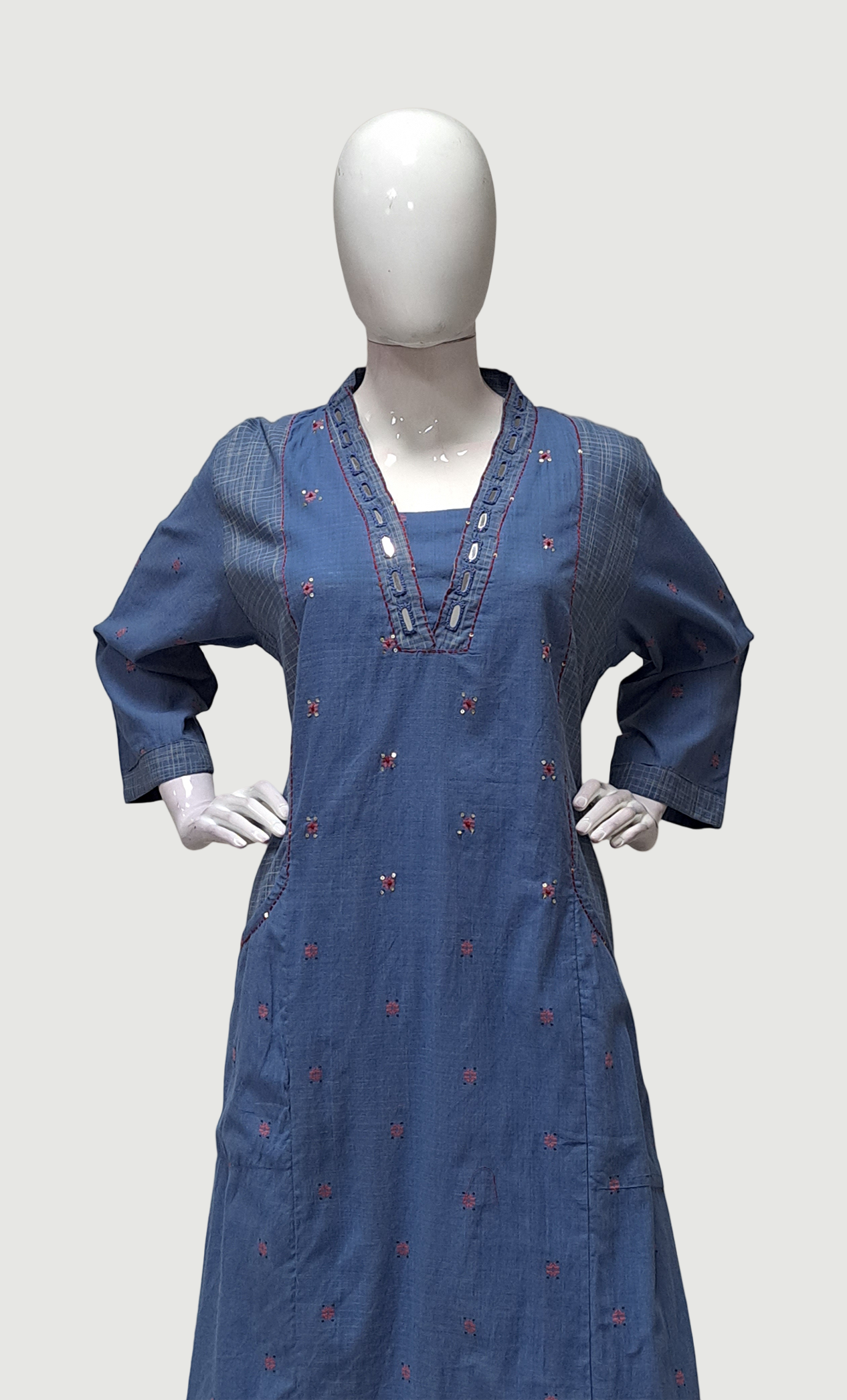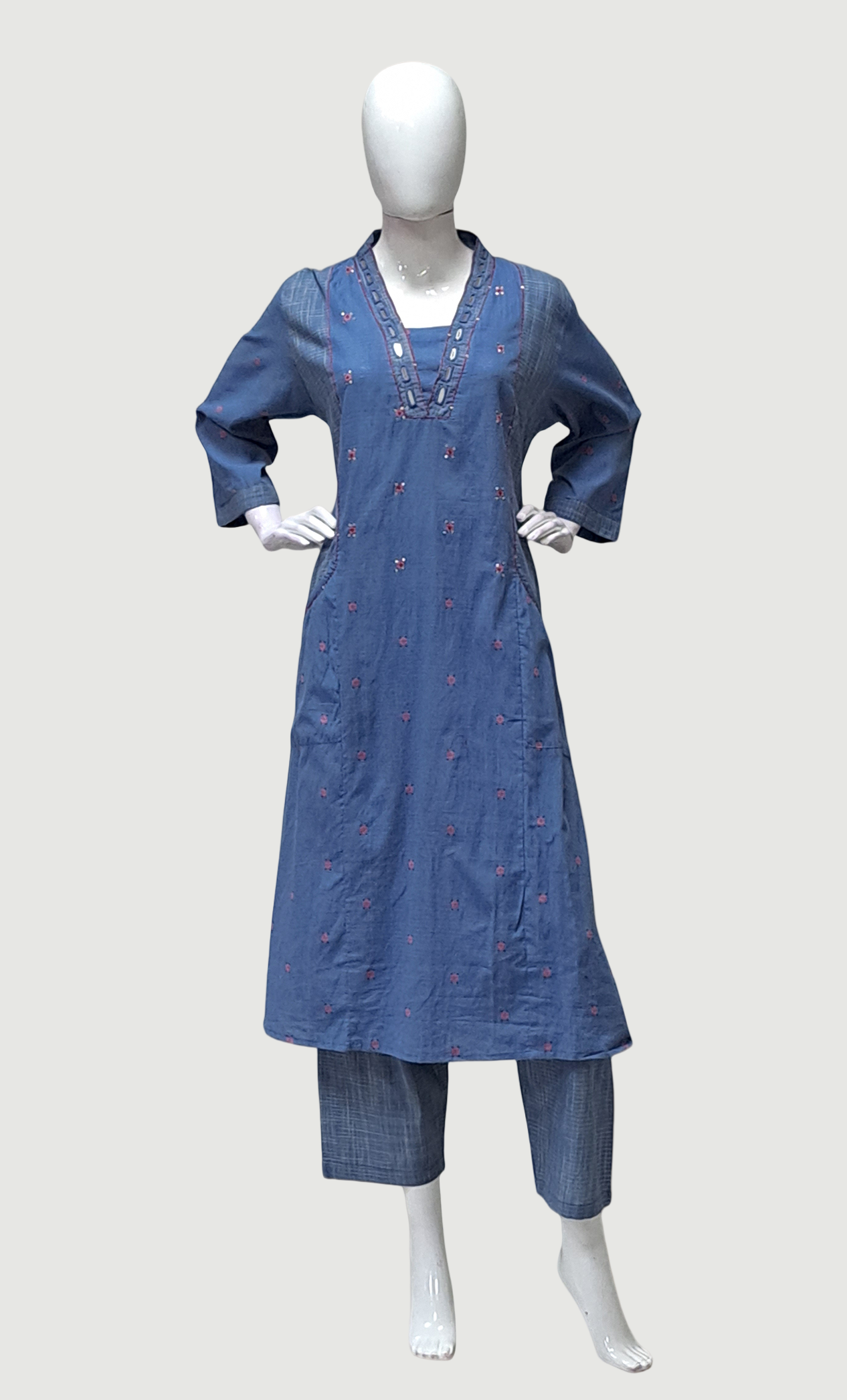 Deep Powder Blue Embroidered Kurti Top & Pants