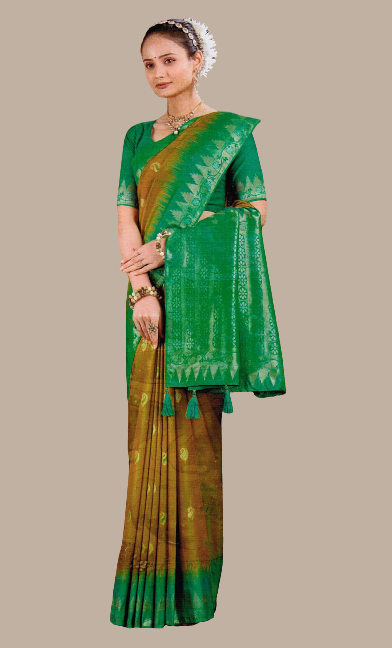 • Deep green with gold woven designs