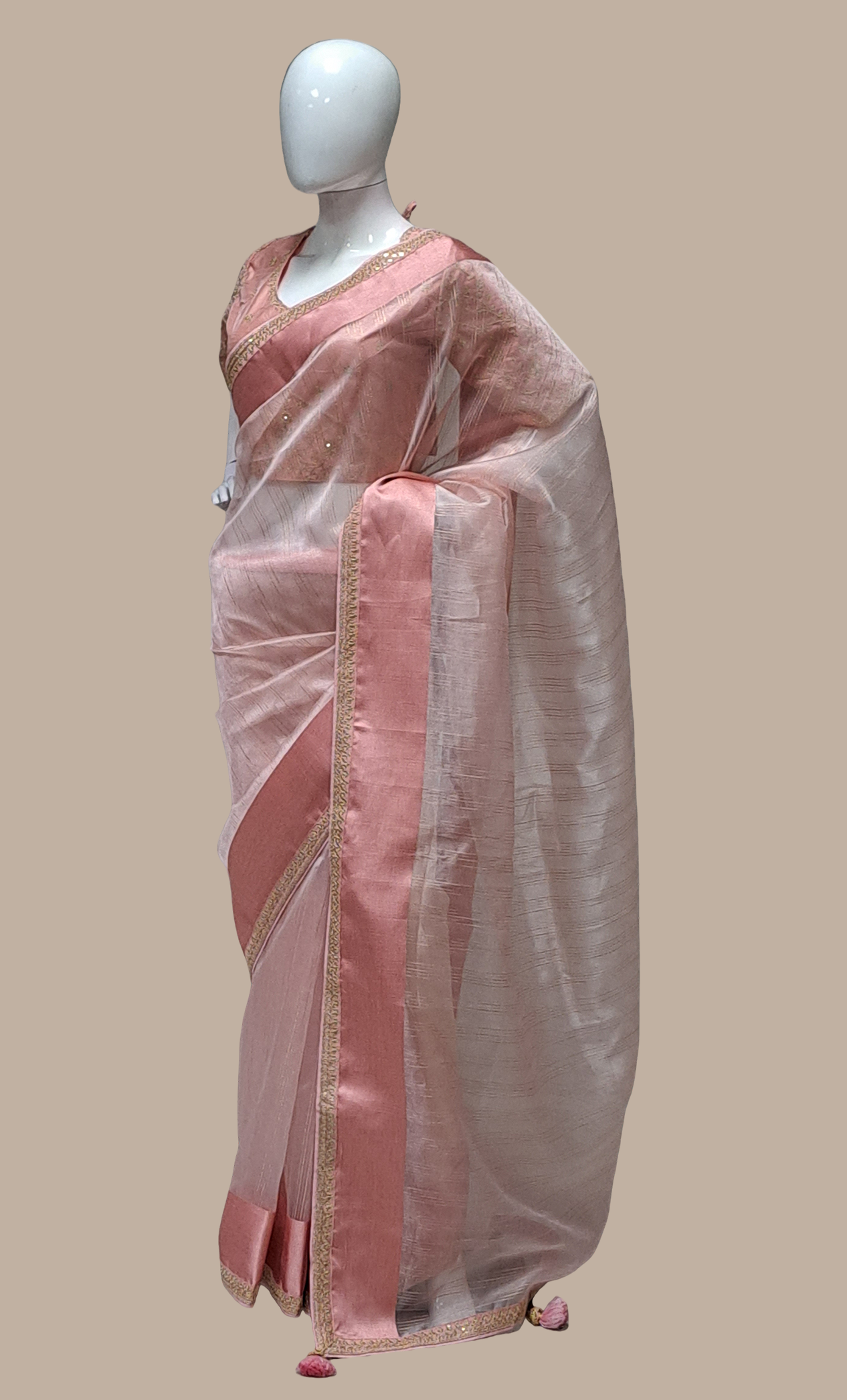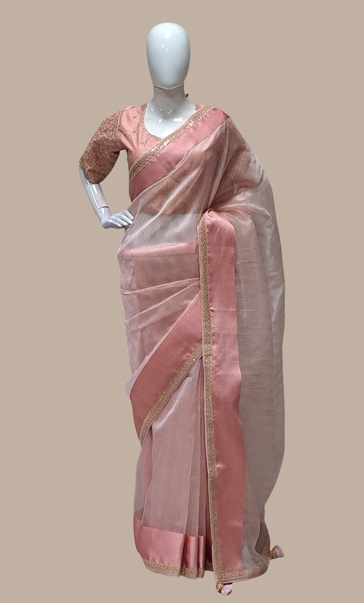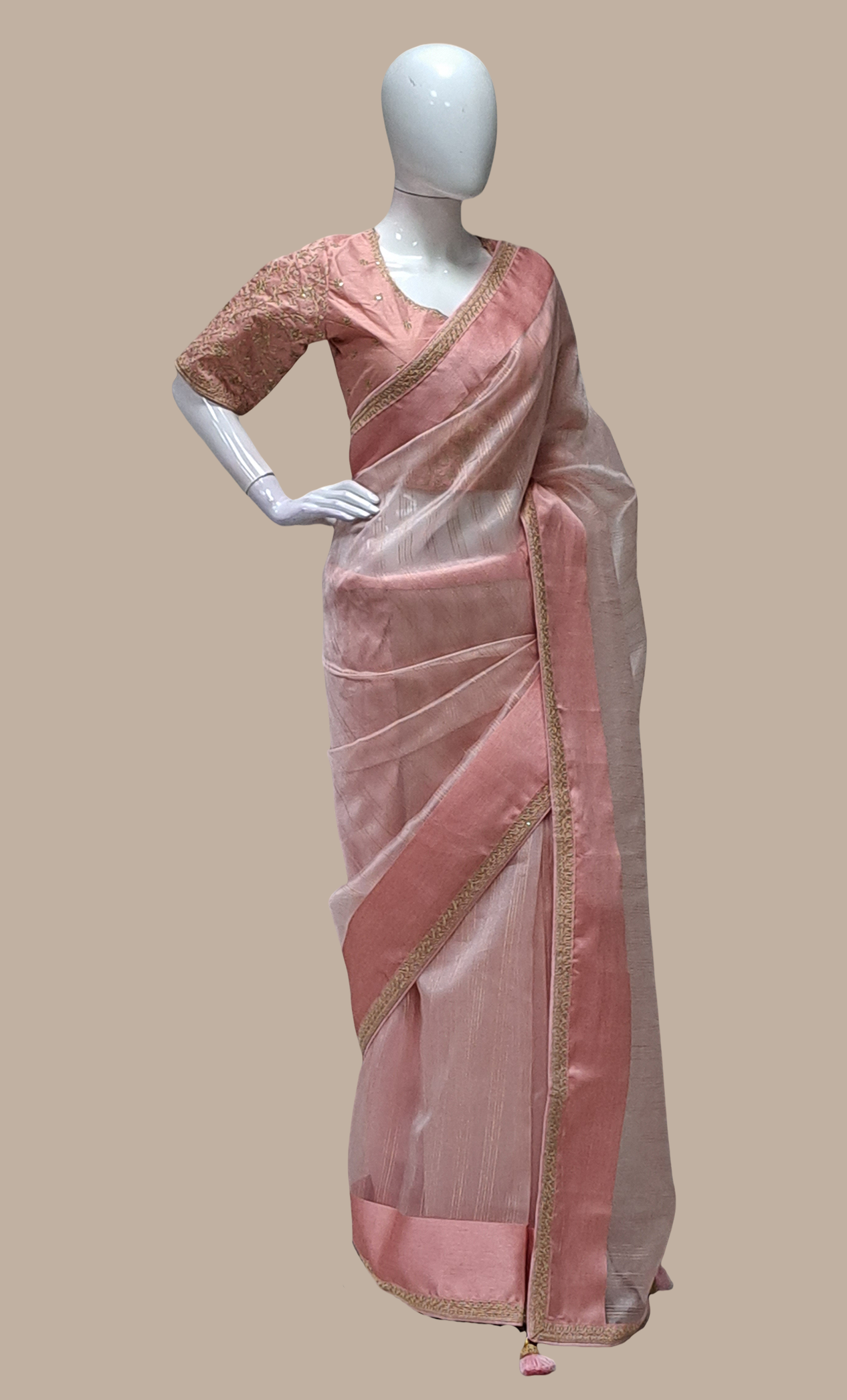 Soft Salmon Pink Embroidered Sari With Ready Blouse