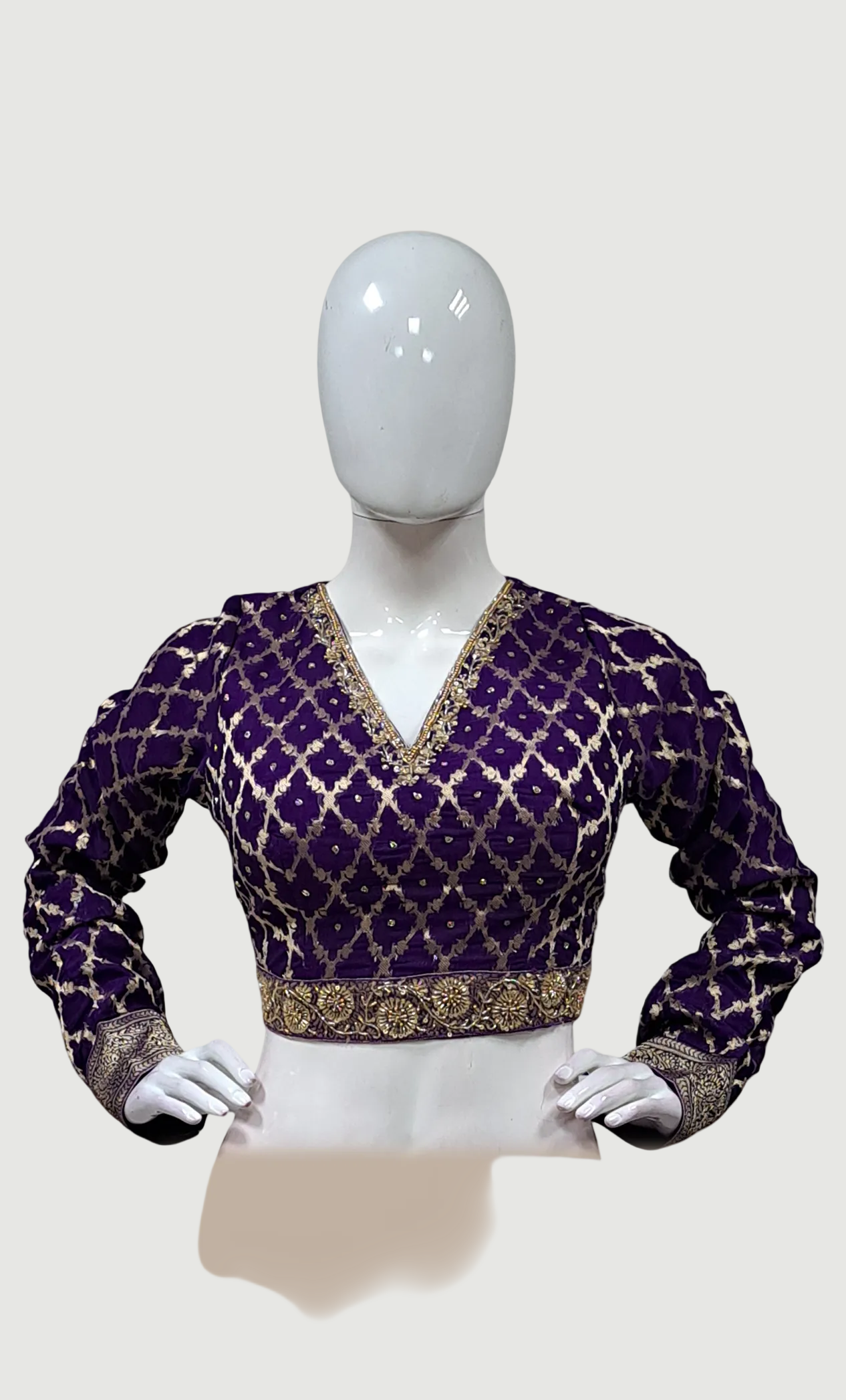 • Readymade long-sleeve top featuring intricate gold woven designs for a sophisticated touch
